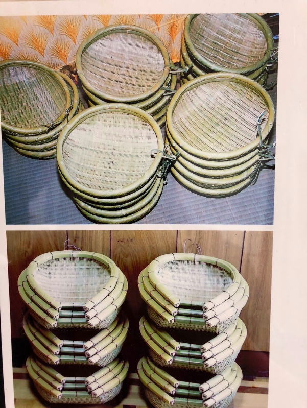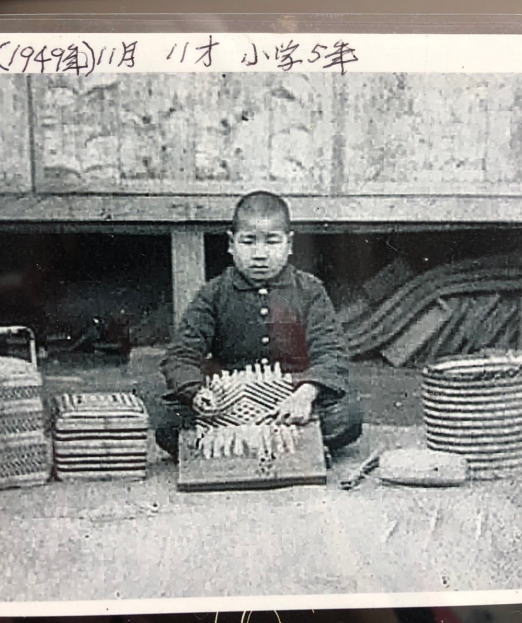 下写真は、彼が11歳のときのものです。 この頃は学校の先生や友達から頼まれて、一つ50円くらいで弁当箱を作っていたそうです。(左の三段物は、他からの注文で、しょけほどではないものの、時折注文があって作られていたそうです) この模様を作るのは小学生の彼が得意とされていた仕事らしく、キキョウなど色々な花の柄を編んでいたそうです。(ランドセルも自分で竹で作られたとか) 当時はどんなカゴをよく編んでいたのですか?と尋ねると、この重箱以外では、かれてご(背負い籠)やウナギてご、イチゴ籠、そして片口じょけ、丸じょけ、飯じょけ・・、とのことでした。 片口じょけは、2尺6寸・2尺8寸・3尺(90cm!)の三つ組を、よく作られていたそうです。
