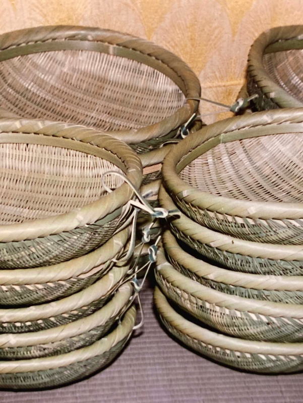 健次さんは水俣に帰省される際、さっと自家用のしょけを作っては、関西のご自宅に持ち帰られたそうです。 娘さんいわく、あるとき飴色だった家のカゴが、突然に青色の新品に戻った記憶がある、とのことでした。 下写真は、今から約20年前に健次さんが作られた、しょけ達です。 定年退職後、関西の地元の竹山近くで一か月ほど倉庫を借りて、これらを作られたそうです。