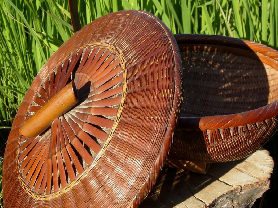 下写真は、その明治生まれの貞喜さんが作られた、飯じょけです。 直径一尺くらい、私はこれをはじめて手にしたとき、その繊細な作りに言葉を失った記憶があります。 ちなみに貞喜さんと、私の師匠の師匠の師匠は、同じ人に弟子入りして竹細工を習った、兄弟弟子の関係にあたります。 (貞喜さんの方が、兄弟子です)